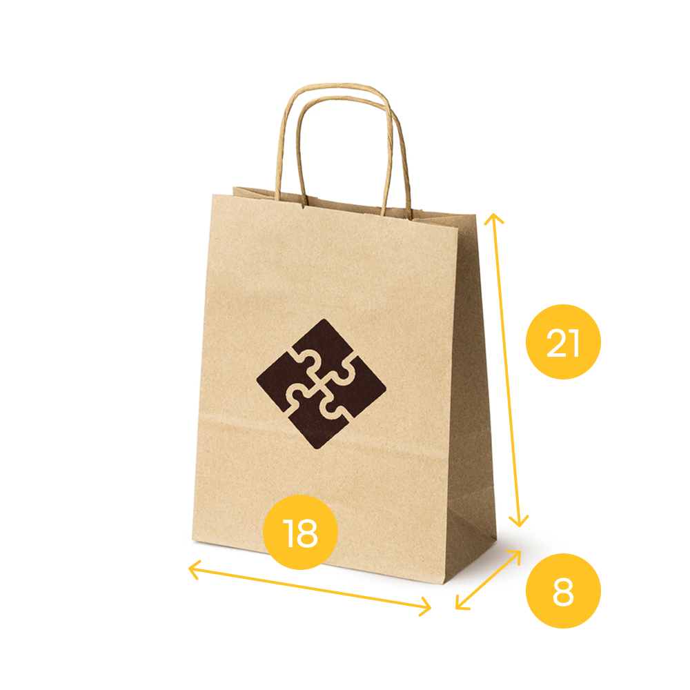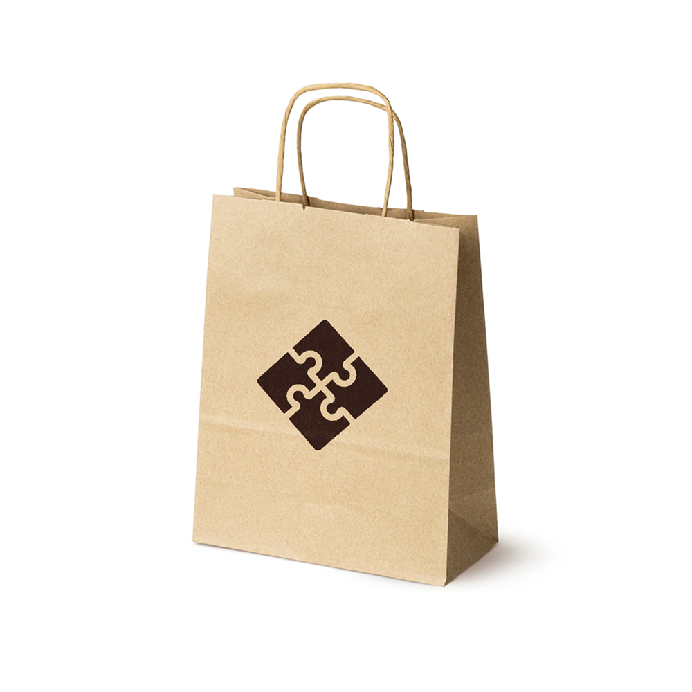 Brązowy papier kraft i skręcane uchwyty – klasyka nowoczesnego, odpowiedzialnego pakowania. Torba dobrze wygląda nawet bez nadruku, ale z personalizacją w czerni lub CMYK zyskuje jeszcze więcej.