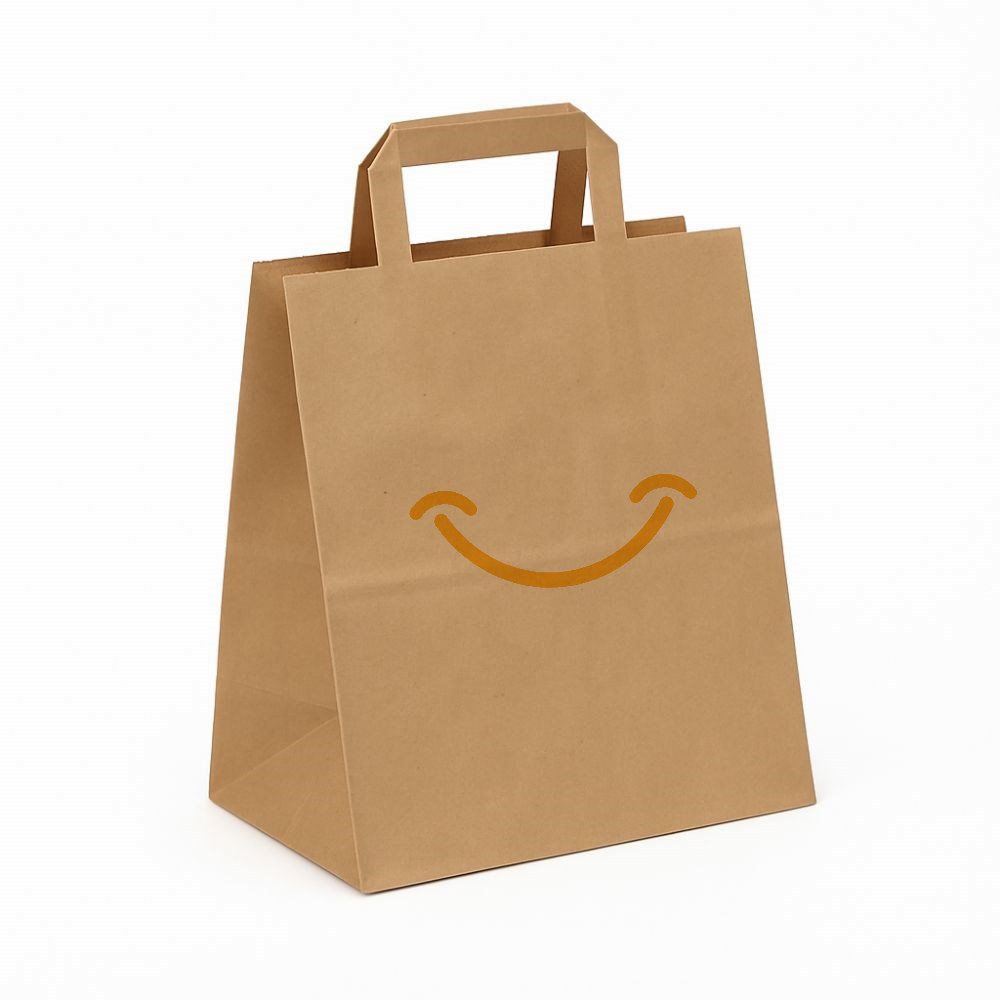 Dzięki możliwości nadruku w czerni lub pełnym kolorze CMYK torba staje się elementem identyfikacji wizualnej Twojej firmy. Nawet proste logo będzie dobrze widoczne na tle brązowego papieru kraft.